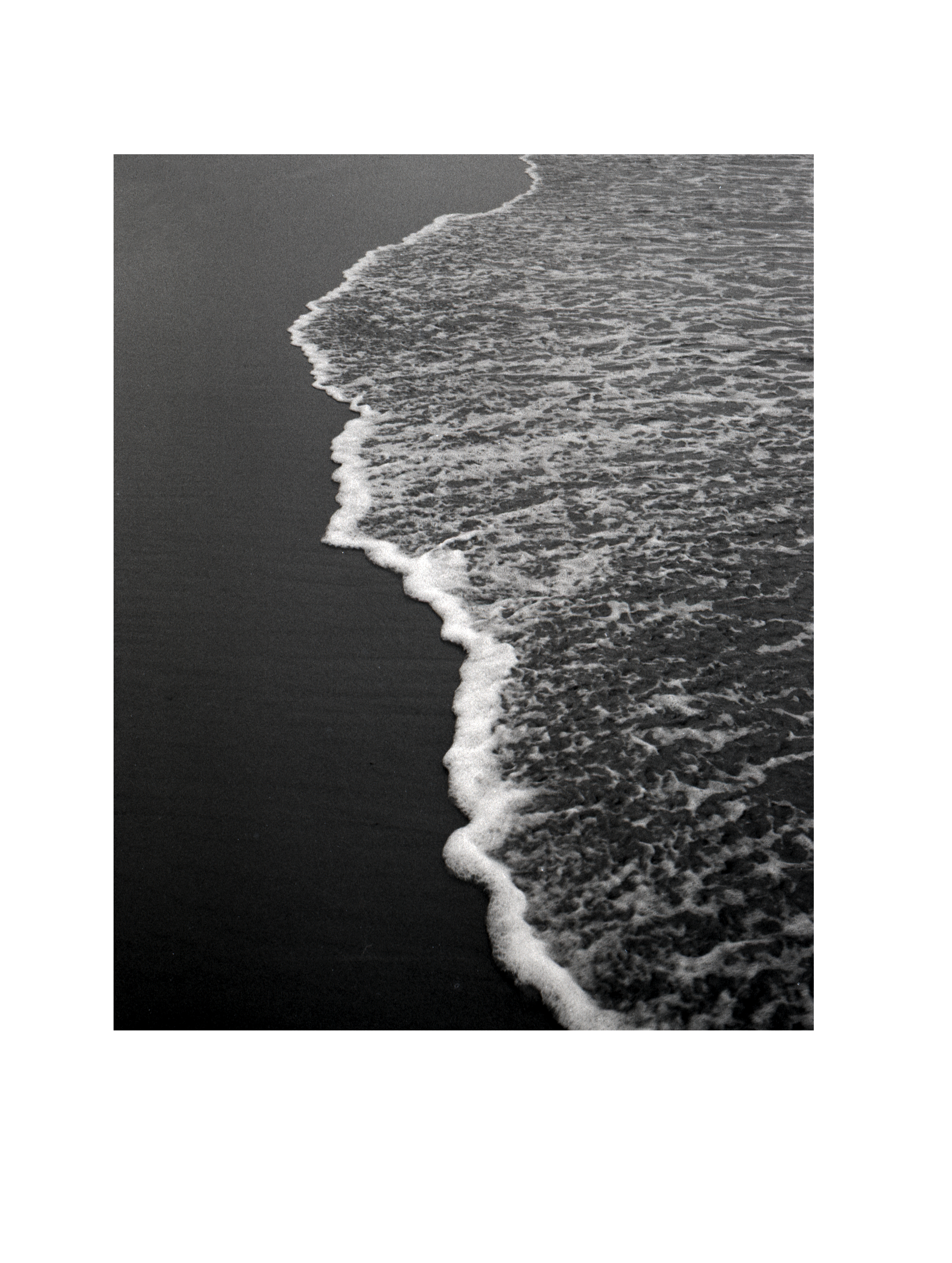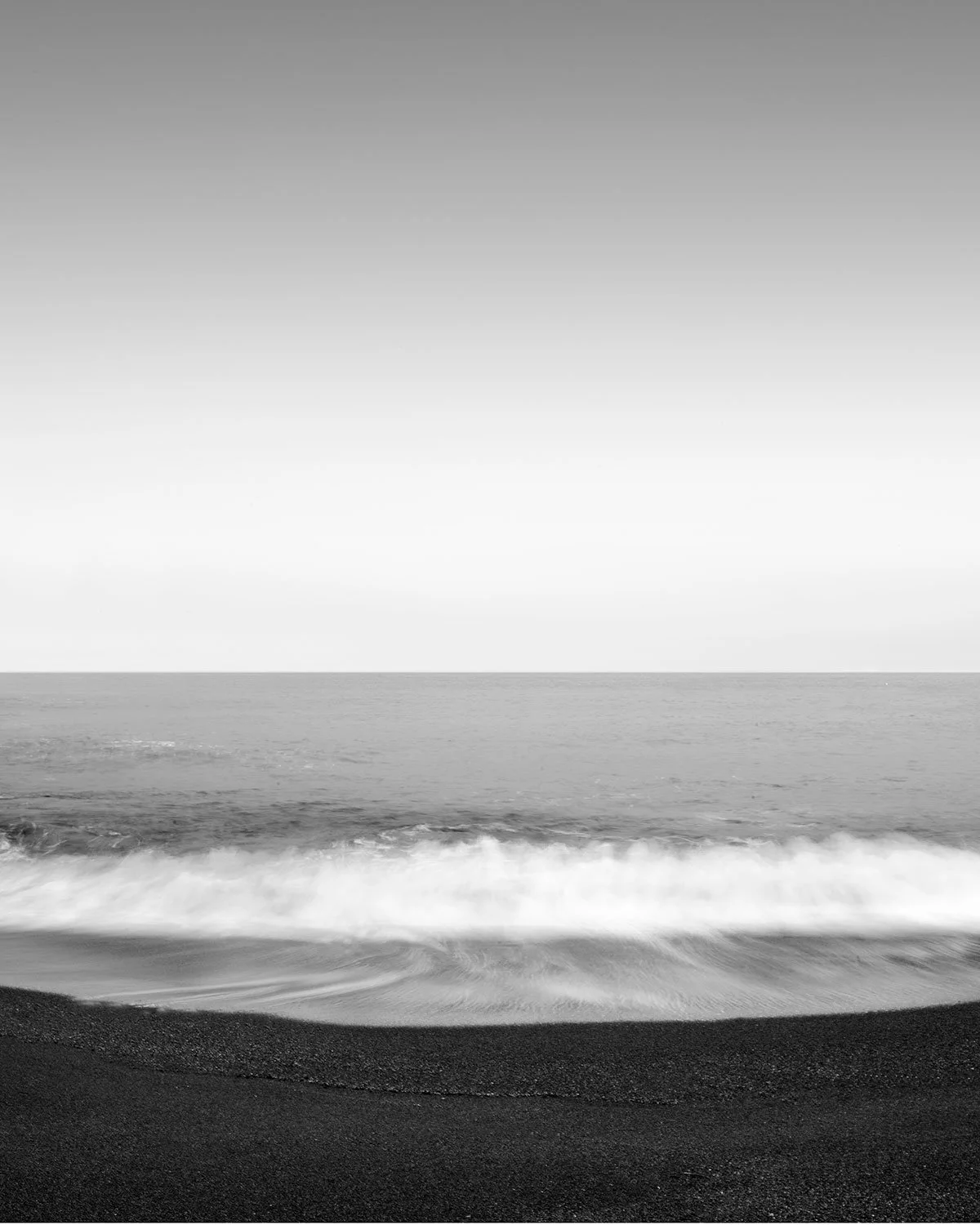 Black and white photo of a calm beach with gentle waves hitting the dark sand shore, under a cloudless sky. View fullsize
